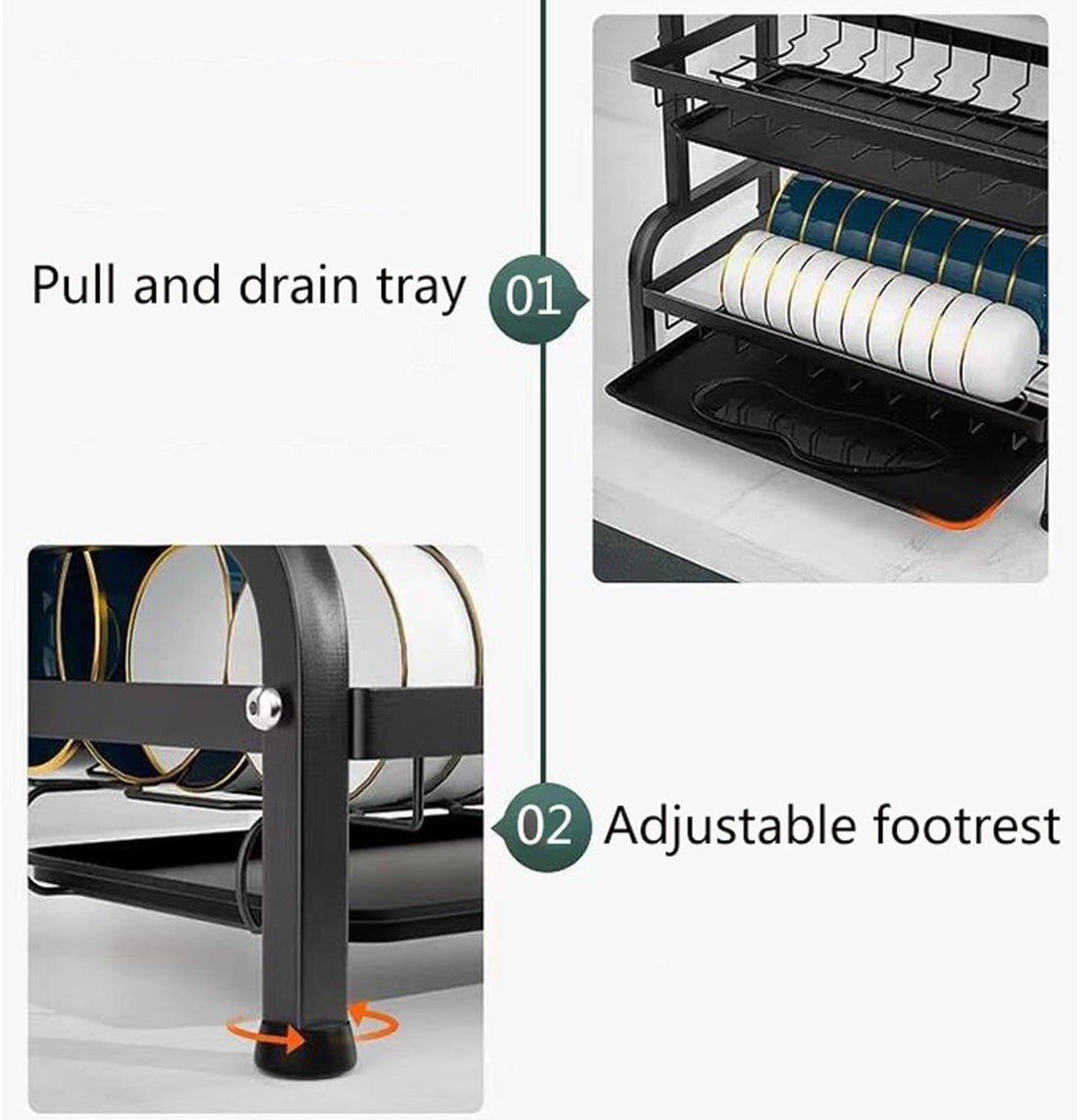 EASY TO CLEAN AND STABILITY: Drawer-type drain tray can be removed and washed separately, collecting sewage centrally and preventing water on the kitchen countertop. What’s more holder has non-slip mat to prevent them from sliding on the countertop, keeping your items safe.
